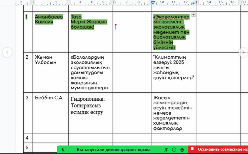2025 жылдың 10 қыркүйегі күні “Мектеп - лицей жағдайында оқушылардың экологиялық мәдениетін қалыптастырудың педагогогикалық шарттары” тақырыбындағы эксперимент жұмысының ғылыми жетекшісі доц. Шүйіншина Шолпан Мырзақасымқызымен эксперимент мамандарының жоба талдау жұмысы онлайн түрде Zoom платформасында өткізілді. #ecolifestyle