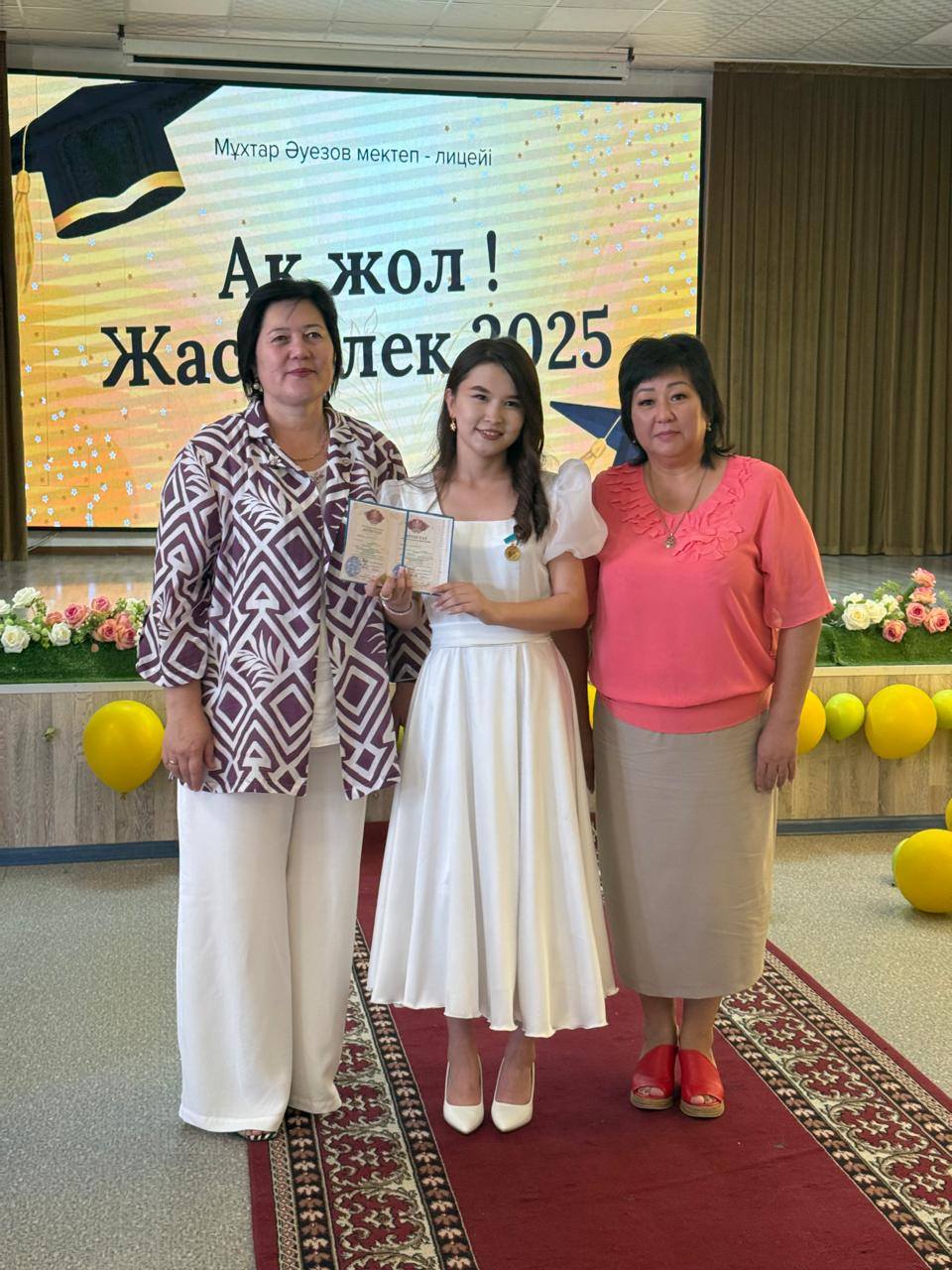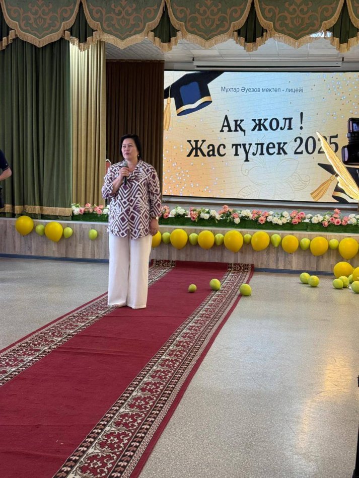 Ақ жол, Жас Түлек-2025... М.Әуезов атындағы жалпы орта білім беретін мектеп-лицейінде 11 сынып түлектеріне арналған "Ақ жол, Жас Түлек-2025" атты аттестат тапсыру салтанатты кеші өткізілді.Еркеліктен есейіп ел үмітін ақтаған, айдары алтынмен апталған бүгінгі түлектеріміз, бүгінгі кештің жарқын жұлдыздары десек қателеспейміз. Жақсы біліммен, тағылымды тәрбиемен өскен ұл-қыздарымыз Отанымыздың қазынасы, елдің ертеңгі елеулі тірегі. Мектеп басшысы Н.Сейсенбаевна түлектердің құттықтап, әрқайсысы өмірден өз орындарын адаспай тауып, алған білімдерін Отанға, Қазақстанға еңбек етуге шақырды. Биыл мектебімізді 74 түлек аяқтап, 7-Алтын белгі, 4-үздік оқушы аяқтады. Бұл ең бірінші ұстаздардың, ата-аналардың еңбегі. Аудандық білім бөлімінің әдіскері Метеркулова Сәуле Абдибаевна және ардагер ұстаз Мендібаев Жаңабек ағай оқушыларға сәт сапар тілеп, жоғары белестерді бағындыруға, білім жолына түсуге шақырды. 11-жыл бойы білім алған, алтын ұя мектеппен қоштасып, аттестаттарын қолдарына алып, нық алға басты...Сәт сапар, Түлектер.... Әуезов мектебі сіздерге есігі әрдайым ашық, ұстаздардың еңбегін бағалайтындарыңызға сенімдіміз!