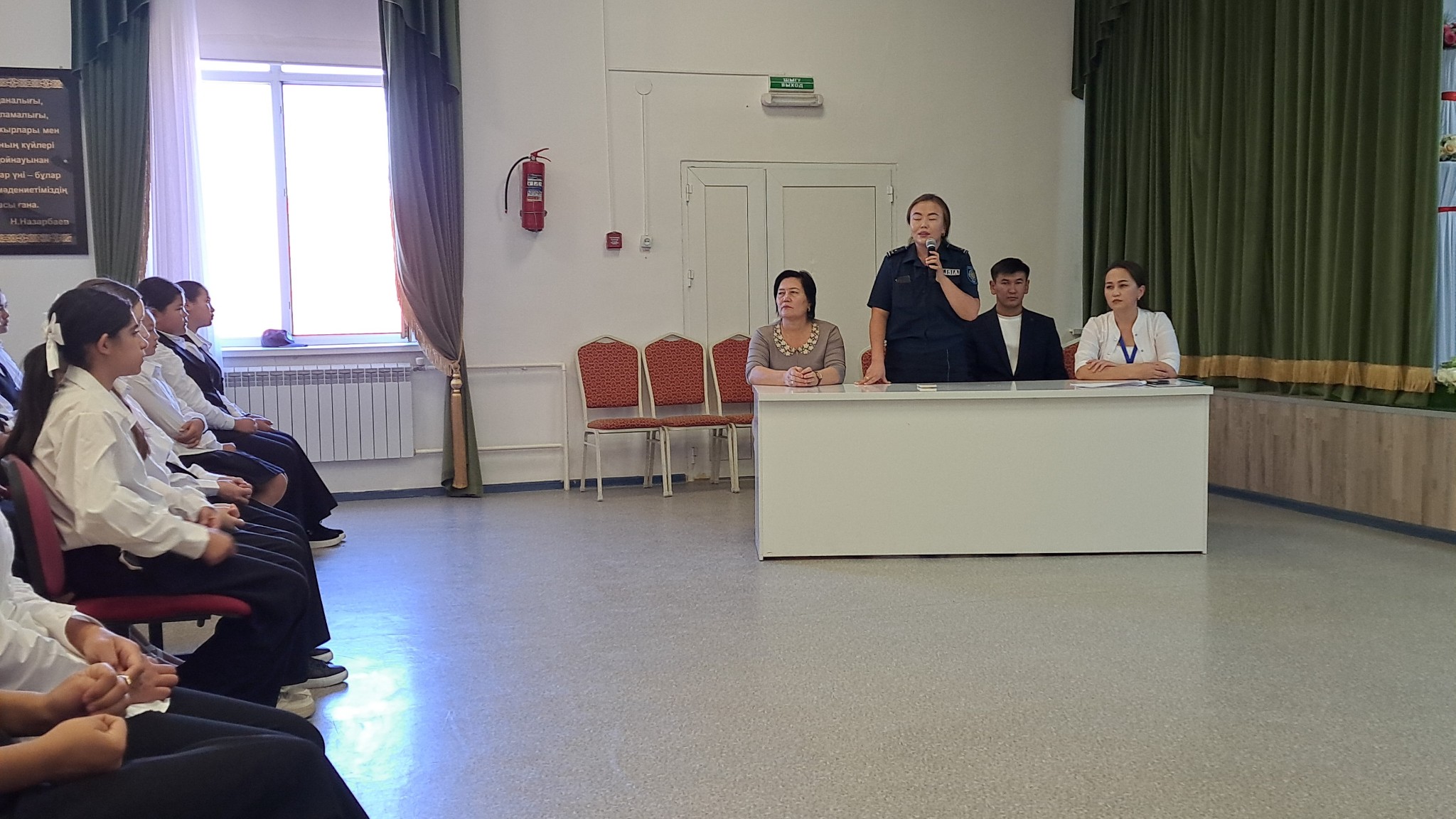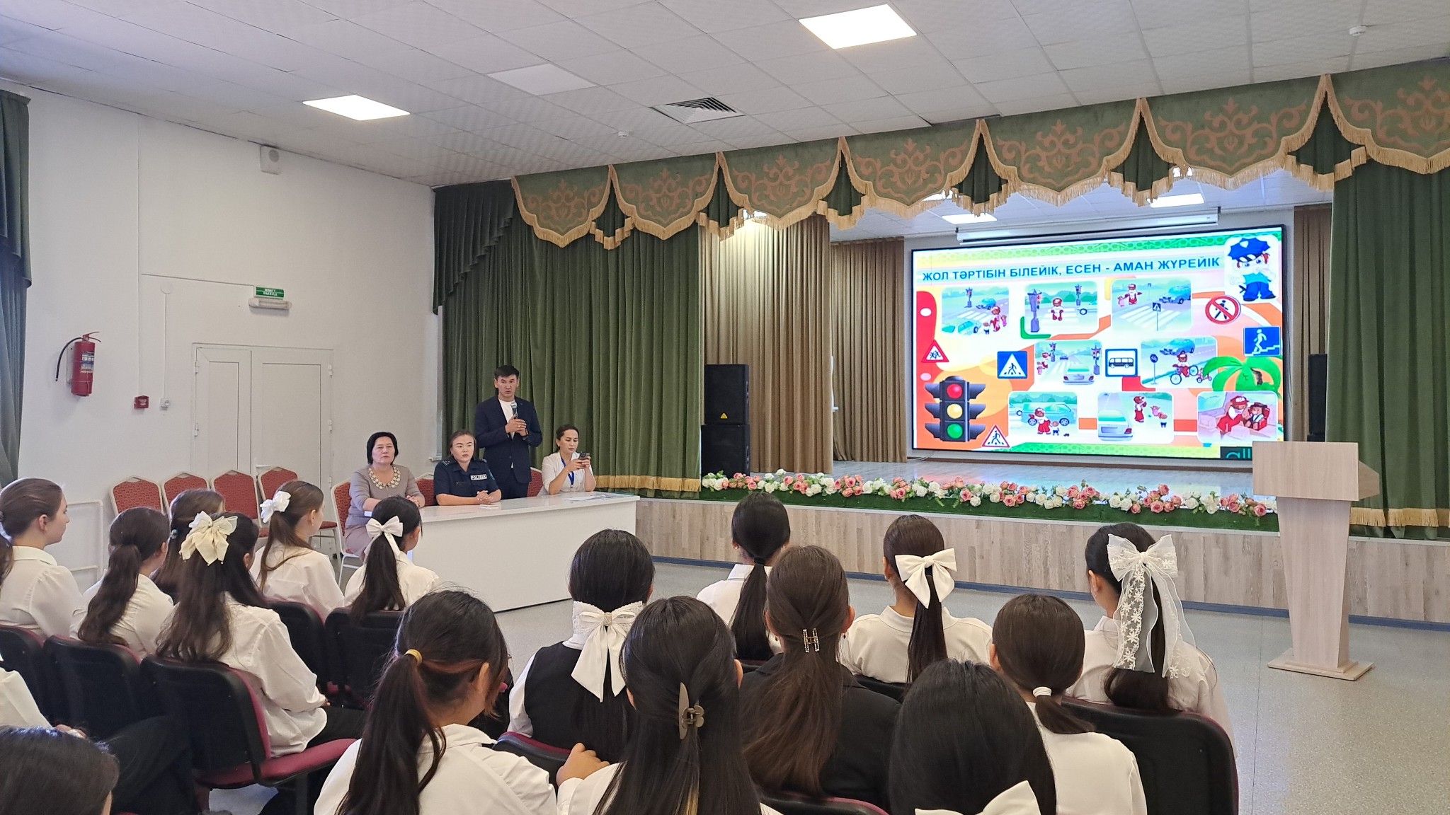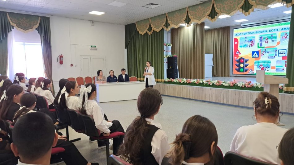 Бүгін, мектебімізде "Жолдағы қауіпсіздік" тақырыбында АББнің әдіскері Көшербаев Д.А, СӨСҚО маманы Сағындық А, мектеп инспекторы Арна Маңызқызы және мектеп директоры оқушыларға дәріс жүргізді. Жол босаңсыуды қажет етпейді. Жолла жүру тәртібін әрбір адам, оқушы, жасөспірімдер дұрыс сақтауы тиіс. Салдары өте ауыр. Осы жайында видео роликтер көрсетілді. Автобус ішінде, көшеде, тіпті қоғамдық орындарда дұрыс жүру айтылды. Бағдаршам көздерін, жаяу жүргінші жолағын мәдениетті қолдана білу қажет екені жан-жақты түсіндірілді.