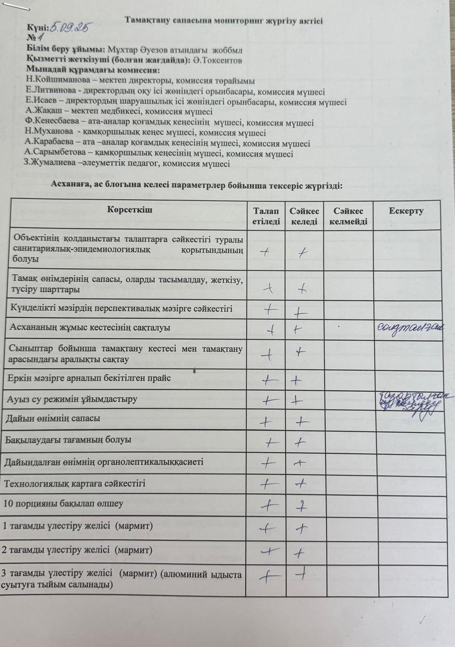 Тамақтану сапасының мониторингісі » "Общеобразовательная школа-лицей имени Мухтар Ауезова"